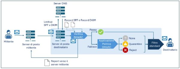 • il destinatario deve configurare il proprio server di posta affinché esegua la verifica DMARC sui messaggi ricevuti.